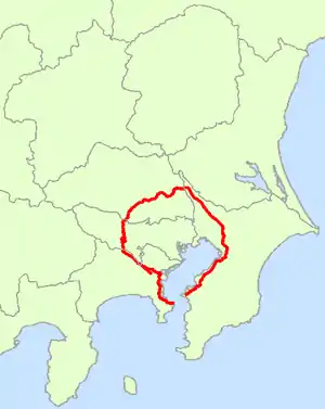 National Route 16 (国道16号, Kokudō Jūroku-gō) is a national highway in Japan. A beltway around Tokyo, it links the major prefectural capital cities of Yokohama (in Kanagawa Prefecture), Saitama (in Saitama Prefecture), and Chiba (in Chiba Prefecture) as well as Hachiōji (in Tokyo). It also serves Yokosuka and Sagamihara (in Kanagawa Prefecture), Kasukabe (in Saitama Prefecture), and Kisarazu (in Chiba Prefecture). The total length is 241 km.[2]