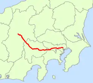 National Route 20 (国道20号, Kokudō nijū-gō) is a national highway connecting Tokyo and Shiojiri, Nagano prefecture in Japan. Originating at Nihonbashi in Chūō, Tokyo, it passes through Shinjuku and four other wards, and then seven cities, including Hachiōji in Tokyo. It follows a westward route into Kanagawa Prefecture, passing through the city of Sagamihara and one town. Continuing into Yamanashi Prefecture, the highway passes through nine cities and towns, among them the prefectural capital of Kofu. In Nagano Prefecture, National Route 20 passes through five cities and towns before entering Shiojiri, where it terminates at the intersection of National Routes 19 and 153. The highway is 225.0 km long.[2]
