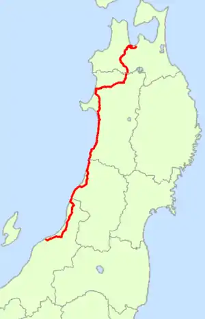 The main line of National Route 7 has a length of 471.8 kilometers (293.2 mi). When bypasses signed as National Route 7 are included, its total distance increases to 559.6 kilometers (347.7 mi).[2] The highway's origin and southern terminus lies in Chuo-ku, Niigata at junction with national routes 8, 17, 113, 116, 289, 350, and 402. The highway passes through Shibata, Murakami, Tsuruoka, Sakata, Yurihonjō, Akita, Noshiro, Ōdate, and Hirosaki. Its endpoint and northern terminus lies in Aomori at a junction with national routes 4 and 45.[3]