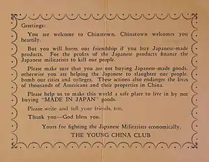 Anti-Japanese sentiment in Peru started during 20th century as part of a general anti-asiatic sentiment after Chinese immigration in Perú, because japanese and chinese people were cataloged as a "yellow menace" that deteriorate the race and invaded Peruvian territory. Politicians and intellectuals tried to generate repudiation against Asians through publications such as bulletins and articles in newspapers and pamphlets that ridiculize them, even inciting the Peruvian people to attack Peruvian-Japanese citizens and their businesses.[54] Peruvian worker protests led to the creation of an Anti-Asian Association in 1917 and the abolition of contract migration in 1923.[55]