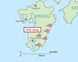 The Japanese 57th Army was formed on April 8, 1945, under the Japanese 16th Area Army as part of the last desperate defense effort by the Empire of Japan to deter possible landings of Allied forces in southern Kyūshū during Operation Downfall. The Japanese 57th Army was based in Takarabe town, Kagoshima Prefecture. It consisted mostly of poorly trained reservists, conscripted students and home guard militia.