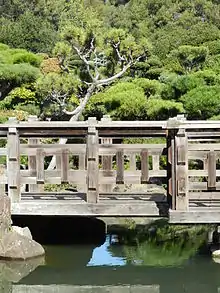 The garden was designed by Kimio Kimura.[2] It follows Japanese garden design principles, using California native stone and plants. [1] The garden contains over 70 plant species including mondo grasses, Japanese black pine, cedar, juniper, and rhododendron.[2] No stains were used on the wood constructions.[1] Nails and fasteners are recessed, and all wood was notched, and aged, to simulate the appearance of a traditional Japanese garden.[1]
