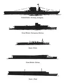 Hōshō was initially designed as a seaplane carrier like HMS Campania with a forward flying-off deck, 32 aircraft, four low-angle 14-centimeter (5.5 in) guns, and four anti-aircraft (AA) guns. The plan was revised after reports were received from Japanese observers with the Royal Navy in Europe about the desirability to be able to land aircraft on the ship. The new requirements were modeled on HMS Furious after she received her rear flight deck in 1918. The ship was to be capable of 30 knots (56 km/h; 35 mph) and fitted with a forward flight deck, island and funnels amidships, and a large hangar aft. Shortly thereafter based on observations of landing trials on Furious and HMS Argus, the world's first flush-decked aircraft carrier, Hōshō's flight deck design was revised in April 1919. The island was removed and the funnels were moved to one side to create an unobstructed, full-length flight deck, and the ship was reclassified as an aircraft carrier. The ship's hull was based on that of a large cruiser and she was given a small island. Her three funnels were mounted on the starboard side and swiveled to lie horizontal during flight operations. Hōshō's designed speed was reduced to 25 knots (46 km/h; 29 mph), based on British experiences during World War I.[6]