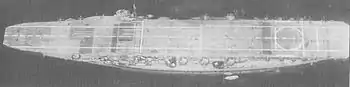 Kaga, like Akagi, was completed with three superimposed flight decks, the only carriers ever to be designed so. The British carriers converted from "large light cruisers", Glorious, Courageous, and Furious, each had two flight decks, but there is no evidence that the Japanese copied the British model. It is more likely that it was a case of convergent evolution to improve launch and recovery cycle flexibility by allowing simultaneous launch and recovery of aircraft.[7] Kaga's main flight deck was 171.2 meters (561 ft 8 in) long and 30.5 meters (100 ft) wide,[8] her middle flight deck was only about 15 meters (49 ft 3 in) long and started in front of the bridge, and her lower flight deck was approximately 55 meters (180 ft 5 in) long. The utility of her middle flight deck was questionable as it was so short that only some of the lightly loaded aircraft could use it, even in an era when the aircraft were much lighter and smaller than they were during World War II.[9] The ever-increasing growth in aircraft performance, size and weight during the 1930s meant that even the bottom flight deck was no longer able to accommodate the take-off roll required for the new generations of aircraft being fielded and it was plated over when the ship was modernized in the mid-1930s.[10] Kaga lacked an island until one was added during the modernization.[11]