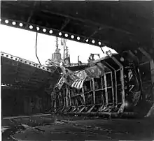 Katsuragi's keel was laid down by the Kure Naval Arsenal in Kure, Hiroshima, on 8 December 1942.[2] She was launched on 19 January 1944 and completed on 15 October 1944.[12] The ship was transferred among a number of ports on the Inland Sea until she arrived in Kure on 15 February 1945 and she was ordered to be camouflaged. Her flight deck was disguised with fake trees, houses and roads; however, her anti-aircraft batteries remained fully manned. Her intended air group, Air Group 601, was committed to the Battle of Iwo Jima about that same time. On 19 March, the ship was attacked by aircraft from Task Force 58 and lightly damaged by several rocket hits; one man was killed and three wounded in the attack. Five days later, the ship was semi-permanently moored at the island of Mitsukojima in Kure harbor and extensively camouflaged. On 20 April, Captain Toshio Miyazaki was appointed commanding officer of Katsuragi.[13]