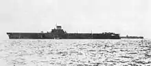Taihō was the first Japanese aircraft carrier to feature an armored flight deck, designed to withstand multiple 500 kg (1,100 lb) bomb hits with minimal damage. The armor varied slightly in thickness between 75–80 mm (3.0–3.1 in) and formed a protective lid over an enclosed upper hangar whose sides and ends were unarmored. The floor of the upper hangar was also unarmored but the lower hangar deck had 32 mm (1.3 in) plating.[4] Taihō's flight deck, measuring 263 m (862 ft 10 in) long and 30 m (98 ft 5 in) wide, had the largest total area of any Japanese carrier until the completion of Shinano and was offset 2 m (6 ft 7 in) to port to compensate for the weight of her island structure.[5] Unlike all pre-war Japanese carriers, Taihō's flight deck was not wooden-planked. Rather, the steel deck was covered with a newly developed latex coating approximately 6 mm (0.24 in) thick. This offered several advantages over wood: it was cheaper, it saved weight, it required fewer man-hours to apply and it was less likely to interfere with air operations in the event of minor damage. On the negative side, the material had only mediocre anti-skid qualities and tended to become brittle and crack over time.[6]