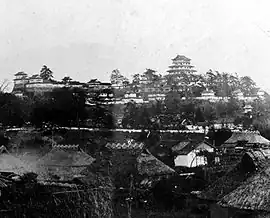 Before the feudal system could be completely overturned, castles played a role in the initial resistance to the Meiji Restoration. In January 1868, the Boshin War broke out in Kyoto, between samurai forces loyal to the disaffected Bakufu government, and allied forces loyal to the new Meiji Emperor, which consisted mainly of samurai and rōnin from the Choshu and Satsuma domains.[11] By January 31, the Bakufu army had retreated to Osaka Castle in disarray and the shōgun, Tokugawa Yoshinobu had fled to Edo (later Tokyo).[12] Osaka Castle was surrendered to the Imperial forces without a fight, and on February 3, 1868, Osaka Castle was burned. The destruction of Osaka Castle, which was a significant symbol of the power of the Shogun in western Japan, dealt a major blow to the prestige of the shogunate and the morale of their troops.