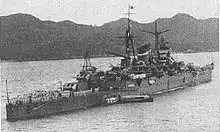 Kumano (熊野) was one of four Mogami class of heavy cruisers in the Imperial Japanese Navy, serving in World War II. She was named after the Kumano River Kii Peninsula on the island of Honshu in central Japan. The Mogami-class ships were constructed as "light cruisers" (per the Washington Naval Treaty) with five triple 6.1-inch dual purpose guns. They were exceptionally large for light cruisers, and the barbettes for the main battery were designed for quick refitting with twin 8-inch guns. In 1937 all four ships were "converted" to heavy cruisers in this fashion.[3] Kumano served in numerous combat engagements in the Pacific War, until she was eventually sunk by carrier aircraft from Task Force 38 while she was undergoing repairs at Santa Cruz, Zambales, Philippines, in November 1944.