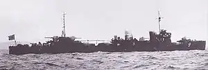 Early in the war, the No. 4 gun and the aft torpedo tubes were removed in exchange for four depth charge throwers and 18 depth charges. In addition 10 license-built 25 mm (0.98 in) Type 96 light AA guns were installed.[5] These changes increased their displacement to 1,499 long tons (1,523 t). Survivors had their light AA armament augmented to be between thirteen and twenty 25 mm guns and four 13.2 mm (0.5 in) Type 93 anti-aircraft machineguns by June 1944. These changes reduced their speed to 35 knots (65 km/h; 40 mph).[4]