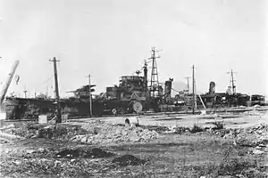 Authorized in the late 1942 by the Modified 5th Naval Armaments Supplement Program,[7] Nara was laid down by Fujinagata Shipyards on 10 June 1944 in its Osaka facility and launched on 12 October.[8] Upon her completion on 26 November, the ship was assigned to Destroyer Squadron 11 of the Combined Fleet for training. The ship was assigned to the squadron's Destroyer Division 53 on 15 March. The squadron was briefly attached to the Second Fleet on 1–20 April before rejoining the Combined Fleet. She was badly damaged when she struck a mine near the Shimonoseki Strait on 30 June. The division was disbanded on 15 July; Nara was disarmed and towed to Moji. The ship was turned over to Allied forces there at the time of the surrender of Japan on 2 September and was stricken from the navy list on 30 November. Unrepaired, she was broken up at Shimonoseki in July 1948.[9]