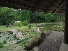 Stepping stones in the garden of the first Kyoto Imperial Palace. These stones were originally part of a 16th-century bridge over the Kamo River, which was destroyed by an earthquake.[18]