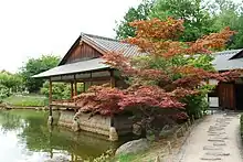 In Hasselt there is a Japanese garden, donated to the Flemish city by the city of Itami, Japan.[2][3] It is the largest Japanese garden in Western Europe, extending for 2.5 hectares.[4] There are other Japanese gardens in Belgium, such as the one in the city of Ostend.[5][6] There is a good relationship between the city of Ostend and the Japanese company Daikin, located in the industrial area of Ostend, and whose company buildings can be seen along the Ostend-Brussels highway.[7] In Laeken, Brussels, there is a Japanese tower, built between 1900 and 1904 by order of King Leopold II.[8][9] Also in Brussels there is a Japanese international school, the Japanese School of Brussels, founded in 1979[10] over a Japanese Saturday school opened in 1974.[11] In Auderghem, near the Japanese School, there is a street named Avenue Nippone ("Nipponic Avenue"—Nippon means "Japan" in Japanese),[12] opened and named thus in 1986, due to its proximity to the school.[12] There are Japanese magazines published for Japanese Belgians.[13]