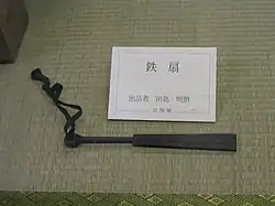 The Japanese war fan, or tessen (Japanese: 鉄扇,てっせん, romanized: tessen, lit. '"iron fan"'), is a weaponized Japanese hand fan designed for use in warfare. Several types of war fans were used by the samurai class of feudal Japan and each had a different look and purpose.[1]