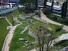 A first rampart made up of a white limestone base from Saint-Victor surmounted by an elevation in raw clay bricks dating from the end of the 5th century BC was also discovered.[5] These fortifications must have been contemporaneous with the large public well, which has now disappeared, located to the north of the area. This archaic rampart was then rebuilt, probably in the second half of the 4th century BC. This new rampart seems to have included, like the previous one, a stone plinth surmounted by an elevation made of large blocks of tuff which replaced the raw bricks.[6] A gate opening onto the route d'Italie in an east–west direction is flanked by two towers or bastions.[7] This wall is clearly visible in the northwest corner of the current garden, preceded by a ditch.