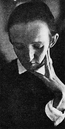 In 1931, Kröschlová opened her own dance teaching studio at the Phoenix Palace and throughout the 1930s taught children's dance classes with a focus on folk dance.[1][7] The following year, her dance company took the bronze medal at the Académie Internationale de le Danse's exposition in Paris with choreography and the libretto Kröschlová wrote for Podvečer parného dne (The Evening of a Steamy Day) by Václav Smetáček.[4][7] In 1936, she played the title role of Kolumba in a feature-length dance drama, using her ideas on the theater of motion, to music written by E. Hohag and a libretto by Miloš Hlávka.[4] In October 1937, the family moved to Munich, where Oskar had been offered a position as a professor at the University of Munich. Finding the conditions under the Nazi regime intolerable, they returned to Prague ten months later and divorced in 1939.[9]