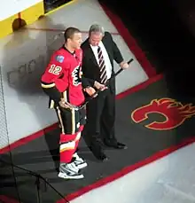 At the start of the 2003–04 season, Iginla was named the 18th captain in Flames franchise history, and 14th since the team moved to Calgary from Atlanta in 1980.[33] His predecessor as captain, Craig Conroy, cited Iginla's experience and leadership for his decision to relinquish the captaincy. "He was a leader on that team and old enough to where he'd been there a long time. It was time for him. He took us to the Stanley Cup Final that year so it worked out pretty well."[34] Iginla was reported to be the first black captain in NHL history,[35] though former Blackhawks captain Dirk Graham, who is of African descent, has also been said to hold that honour.[36]
