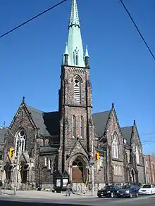 The Jarvis Street Baptist Church was designed in the Gothic Revival style by the architectural firm of Henry Langley and Edmund Burke who served for many years at Jarvis Street Baptist Church as a Sunday-school teacher, chair of the choir committee, and deacon. It was one of the first churches in Canada to be built with an amphitheatre-shaped interior. The ground floor seating is grouped in a semicircle, while the gallery above is horseshoe shaped.[10] The main façade of the building is made out brown stone that is obtained from the regions of Queenstown.[11] The stone is laid unevenly with a pattern that varies in different shades of browns and dark yellows. The material used for the roof is Canadian slate. The roof is constructed from a series of pitched segments that are centrally connected by a horizontally sliced dome. There are eight entrances, each consisting of solid oak double doors framed with pointed sandstone arches. Several of these doors have been blocked off with black cast iron gates. Triangular sets of small rosette windows are placed above every door to fill the space in between the entrance and the top of the arch. The building has number of columns with slim tall shape and different capitals that are loosely based on a Corinthian order. The capitals are made of gray stone while the columns are of a high quality bronze shaded granite found in St. George, New Brunswick.[11] The main entrance is set under the only tower of the building facing the south west side which serves as a vertical axis to the building. A copper spire sits on top of the tower, adding approximately nine metres (30 ft) to the existing roof height. In addition to the vertical axis the building also has a horizontal symmetry axis that goes diagonally through the building. The flat-roofed extension of the church, built after the 1938 fire, was constructed with red brick masonry which contrasts with the charred Queenston façade.