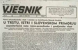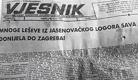 Shortly after the premiere, Krnić went through the Zagreb state archives and examined all the May 1945 issues of Vjesnik, the newspaper in question. He found that no such headline exists. Upon closer inspection, Krnić discovered that the headline seen in the film had been crudely doctored, likely using Photoshop, since the article seen below the doctored headline matches with another news story unrelated to Jasenovac. By comparing other articles present on the front page, Krnić concluded that the original issue of Vjesnik used for the forgery was published on 15 May 1945, and that nothing except the main headline was changed for the film, except the publication date itself, which was obscured in Sedlar's film by a faked damage effect.[37] Sedlar denied forging the headline and maintained that it was authentic.[38] In an interview for N1, a regional news channel, Sedlar said he paid an unnamed private collector in Belgrade to film his copy of the Vjesnik issue, adding that the people who own it are "thieves" who probably "stole it somewhere". He added that he does not own a copy himself.[39]