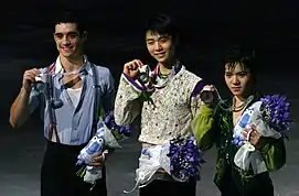 His assigned events for the 2011–12 Grand Prix season were Skate Canada and Cup of Russia. At Skate Canada, Fernández executed the only clean quadruple jump in the short program to take the lead over Daisuke Takahashi and Patrick Chan.[31] He placed second in the free skate and won the silver medal overall, exceeding his combined total personal best by over thirty points. He became the first Spanish skater to win a Grand Prix medal.[5] At the Cup of Russia, he placed fourth in the short program, first in the free skate, and finished second overall with an overall total of 241.63 points — only 0.03 behind gold medalist Yuzuru Hanyu of Japan.[32] Fernández became the first Spanish skater to ever qualify for the Grand Prix of Figure Skating Final when he qualified for the 2011–12 event. In Quebec City, he was third in the short program and fourth in the long to win the bronze medal, and in so doing, became the first Spaniard to medal at a Grand Prix Final.[33][34][35] Fernández reclaimed his national title, winning by over eighty points.[36]