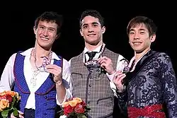 Fernández skated a clean short program at the 2015 World Championships in Shanghai, which included a quad Salchow, a triple Lutz-triple toe loop combination, a triple Axel and level-four spins. But his step sequence was rated level-three and his triple Axel was not perfect.[63] He earned 92.74 points and stood in second place, less than 2.5 points behind Yuzuru Hanyu.[64] He produced a free skate with two quads, six triples, level-four spins and level-three step sequence. His only major error was a fall on a quad Salchow attempt. He placed second in the segment with 181.16 points – his strongest free skate of the season – more than 5 points ahead of Hanyu and just 0.67 behind Kazakhstan's Denis Ten. Overall, he outscored Olympic champion Yuzuru Hanyu (silver) and Olympic bronze medalist Denis Ten (bronze) for the gold medal, having received a total of 273.90 points.[65] He became the first skater from Spain to win a world title in figure skating.[66]