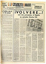 Due to lack of funds Pascual failed to launch technological overhaul of antiquated newspaper;[59] he made it look more agile by re-arranging the layout,[60] introducing new columns[61] and bringing in new staff.[62] The key change, however, was de-emphasizing Traditionalism and saturating the pages with novel democratic ideas of the Hugocarlistas.[63] The editorial line championed by Pascual avoided open confrontation.[64] To the contrary, the change was styled as renovating Carlist thought; he presented Carlism not as a fixed doctrine but rather as a dynamic approach.[65] Key elements of this strategy were highlighting two pillars of the movement's ideological toolset: unswerving loyalty to the Carlist dynasty[66] and to the Church.[67] As the former was getting dominated by Don Carlos Hugo and the latter were undergoing transformation adopted at Vaticanum II, the strategy worked as a trap for conservatively-minded readers; it also served as a springboard to advance increasingly Left-wing ideas.