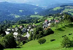 The local church is dedicated to Saint Giles (Slovene: sveti Tilen). It was originally a Gothic church with an angled apse. Around 1710 it was made taller and renovated in the baroque style. The belfry is from the 16th century. The church was again widened and extended in the 1920s. The three altars are from the late 19th century.[7] The paintings in the church are by Janez Šubic, the altar is the work of Štefan Šubic, and the Stations of the Cross are by Leopold Layer. The village chapel shrine, which contains a Gothic Pietà from 1440, was painted with frescoes by Štefan Šubic in 1861.[6]