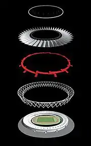The 53,800 m2 (579,000 sq ft) Teflon-coated roof, designed by the German structural engineering and consulting firm Schlaich Bergermann Partner, was built at a cost of ₹308 crore (US$67.36 million).[7] Taiyo Membrane Corporation supplied and installed the PTFE glass fibre fabric roof.[14] It is the one of the largest membrane roof system in the world. 8,500 tonnes of steel were used in the construction of the stadium's roof and its support structure. A new 10-lane synthetic Olympic standard running track and a synthetic grass field were added. A 400-metre warm-up track was also constructed. A 150 metre long tunnel below the ground of the stadium was constructed for the opening and closing ceremonies. In case of emergency, the construction of the stadium allows for all 60,000 spectators to be safely evacuated within 6 minutes.[15] A new Electro-Voice professional audio system by Bosch Communications was set up in the stadium.[16]