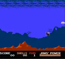 Once Jaws' health has been reduced in the side-view encounter, the game changes to a "first person" view of the player's boat. Players are given three charges for their strobe device to force Jaws to breach the water's surface. Timing is essential in order to force Jaws to breach at the proper distance from the bow of the boat. Players can also jut the bow of their boat forward at any time. In order to fully defeat Jaws, the player must jab it with the boat's bow at the proper distance when it breaches from the strobe device. This can be quite difficult and requires much patience. Jaws makes random movements backward, forward and side-to-side which makes for a difficult final kill.