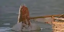 In the original theatrical version's ending, Ellen rammed the shark with Mike's boat, mortally wounding it. The shark then causes the boat to break apart with its death contortions, forcing the people on the boat to jump off to avoid going down with it.[13] American audiences disapproved of this ending. Following this, a different ending was ordered to be shot for foreign distribution in which the shark gets stabbed with the bow sprit and then inexplicably explodes, with Jake being found wounded but alive. Universal used this ending on home media releases.