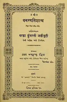 Herbert Mills Birdwood and MacNaghten attempted to help Indraji obtain a suitable employment but Indraji would not accept working with anyone but Bhagwan Lal. Through MacNaghten, the Maharaja of Porbander offered assistance for Indraji to study the flora of the Barda mountain. Frederick Styles Philpin Lely, the British administrator for Porbander also supported the project and Indraji was appointed as Curator of Forests and Gardens of the state of Porbander on 1 October 1886. Initially Indraji declined the offer as the salary was Rupees 100 a month but on the influence of MacNaghten and Lely this was increased to 200 and he took the offer. Jayakrishna worked with the local shepherd community, the Rabaris, to collect ethnobotanical information. One of his studies was on the lethal effects of Indigofera cordifolia on sheep that grazed them shortly after the rains.[13] He worked for 19 years in the region and produced his magnum opus, on the Flora of Barda Mountain only in 1910. Although he was persuaded to write it in English, he chose to write it in Gujarati and titled it "Vanaspati Śāstra, A Complete and Comprehensive Account of the Flora of Barda Mountain". He wrote: "Europeans placed in their countries know and write about the plants of this country, and my countrymen would not know about the plants in their courtyard and those trampled under their feet. I will write the book in my mother tongue". When the manuscript of the book was ready, the Maharaja of Porbander had died and there was no monetary support for it. Finding a publisher was difficult. He once met Lalshankar Umashankar on a train and the latter offered to print the book through the Gujarat Vernacular Society on the condition that he removed the dedication page to the King of Porbander State. Indraji refused to accept the condition. He finally printed it at his own cost, pawning some of his wife's jewellery, and only a 1000 copies were printed with many left unsold that forced him to halve the price. He retired and moved to Kutch where the Maharaja of Kutch took an interest and made him Superintendent of the Palace and made him in-charge of reforestation and planting. He promoted the use of tree planting to block the expansion of dunes and wrote a book Plants of Kutch and Their Utility (1926) which included 99 line drawings.[12]