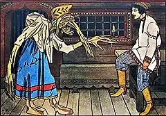 Some scholars interpret this scene as a political parody. Peter the Great persecuted Old Believers, who in turn referred to him as a crocodile. Some lubki feature a ship below the crocodile with Baba Yaga dressed in what has been identified as Finnish dress; Peter the Great's wife Catherine I was sometimes derisively referred to as the chukhonka ('Finnish woman').[9] A lubok that features Baba Yaga dancing with a bagpipe-playing bald man has been identified as a merrier depiction of the home life of Peter and Catherine. Alternately, some scholars have interpreted these lubki motifs as reflecting a concept of Baba Yaga as a shaman. The crocodile would in this case represent a monster who fights witches, and the print would be something of a "cultural mélange" that "demonstrate[s] an interest in shamanism at the time".[10]