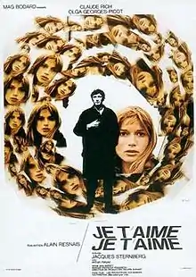 Je t'aime, je t'aime ("I Love You, I Love You") is a 1968 French science fiction film directed by Alain Resnais from a screenplay by Jacques Sternberg. The plot centres on Claude Ridder (Claude Rich) who is asked to participate in a mysterious experiment in time travel when he leaves the hospital after a suicide attempt. The experiment, intended to return him after one minute of observing the past, instead causes him to experience his past in a disjointed fashion.