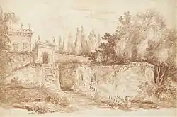 Richard made numerous prints of both Fragonard's and Robert's work, including Robert's Vue prise dans les jardins de Villa Mattei aux environs de Rome (View of the Gardens at the Villa Mattei) in 1761.