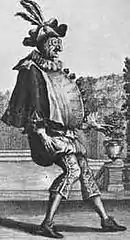 Bérain also designed for the theatre. By 1674 he had already begun designing costumes for Jean-Baptiste Lully's Opéra, including costumes for dancers in the divertissements. For Lully's 1684 opera Amadis, a tale of chivalric romance, Bérain carried out research into the styles of the Middle Ages and the Renaissance, a historical approach to costume design that was unusual for the time. Besides costume designs for Lully's tragédies en musique, Bérain designed the costumes for Lully's ballets Le triomphe de l'amour (1681) and Le temple de la paix (1685).[7]