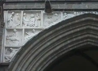 He was elected an official of the Academy des Beaux-Arts on February 29, 1936, to replace Hippolyte Lefèbvre. In his last years Boucher was working on new designs for a replacement for the bombed monument to Breton unity with France. He completed maquettes of more than one proposed design. One of the objections of Breton nationalists to the earlier statue had been that it portrayed the duchess Anne of Brittany kneeling submissively before the King of France, so the new designs carefully stressed the equality of the figures. However, the replacement project was abandoned after Boucher's death and the outbreak of war in 1939.[2] Another of his late projects also remained unfinished, his memorial to Camille Desmoulins and the storming of the Bastille. After his death the stone sculpture was sawn into several pieces for storage. Intended for display in Paris, it was eventually reconstructed and displayed in Boucher's home town of Cesson-Sévigné.