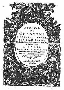 - IIe livre des chansons à danser et à boire de Jean Boyer, de la Musique de la chambre du Roy [1-2 v.]. Paris, Robert III Ballard, 1642. 1 vol. 8°. RISM B 4184, Guillo 2003 n° 1642-B. This edition was collected in 1644 by Robert III Ballard (Guillo 2003 n° 1644-E) and in 1699 by Christophe Ballard (Guillo 2003 n° 1699-F).