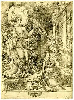- The Annunciation, Eisler no. 12; see Zerner (1994) p.211. Blunt however points out that one borrowing from Raphael reflects the original in Italy, rather than the several print copies of it, concluding that either Duvet saw the original, or an unknown drawing of it.