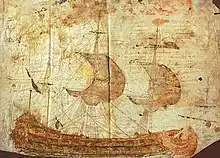 On July 24, 1684, the expedition left La Rochelle for the New World with 300 people aboard 4 ships. The members included 100 soldiers, 6 missionaries, 8 merchants, over a dozen women and children, and artisans and craftsmen.[11][12] Fifty-eight days later,[12] the expedition stopped at Santo Domingo (Saint-Domingue), where one of the ships, the St-François, which had been fully loaded with supplies, provisions, and tools for the colony, was captured by Spanish privateers.[13] L'Archevêque joined the expedition with Pierre and Dominique Duhaut when La Salle stopped at Petit-Goâve, the French West Indies outpost, to acquire provisions, which were purchased with credit extended by the brothers Duhaut.[14] The Duhauts were then given trading privileges and allowed space for merchandise on La Salle's ships that would have ordinarily been reserved for supplies for the colony.[14] L'Archevêque had come to Petit-Goâve with his merchant-trader parents, and claimed kinship with the Duhaut brothers.[15]
