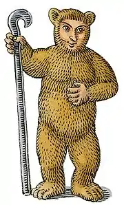 One Basque version of the tale is Juan Artz, edited by Resurrección María de Azkue accompanied by Spanish translation.[147] The name Juan Artz denotes "Juan Bear", where hartza is the word for "bear".[148] The story begins by stating "They say that Juan was raised by a she-bear in the mountains because his mother had no breast".[149][150] This pattern where not a male but female bear is involved, and suckles the infant, is given by Delarue as one of the alternative origins for hero in the tale group, but it is not exhibited in many examples in his list.[151][lower-alpha 39] This motif of a she-bear raising the hero is paralleled by Orson in Valentine and Orson, a tale widely read in roman bleue (chapbook) form in the early modern period.[152][153]