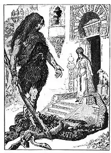 Jean de l'Ours is a beautiful abandoned child raised by a mother bear in Henri Carnoy's version (1885).[22] Along the same vein, Jean de l'Ours was a beautiful foundling adopted by a widow according to Carnoy in another version (1885, illustrated by Édouard Zier),[23] but this, except for an altered telling of the boy's origin, is by and large identical to the tale given earlier by Hippolyte Babou (1862):[lower-alpha 5][24] In both texts he is depicted as an angel-faced, blue-eyed boy who wears a bearskin around his loins, has a lush mane like Samson's falling from head to chest, and carries a poplar sapling as a staff.[25][26]