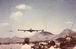 The Army was still unable to deal with Talib's stronghold. The few paths up the Jebel Akhdar were far too narrow to deploy attacking battalions or even companies. One attempt was made against the southern face of the Jebel, using four infantry companies (including two companies from the Trucial Oman Scouts, from what would later become the United Arab Emirates). The attackers withdrew hastily after concluding they were vulnerable to being ambushed and cut off. In another attempt, infantry launched a feint and then withdrew while Avro Shackleton bombers of the RAF bombarded the supposedly massed defenders but they inflicted no casualties.[61] De Havilland Venoms, flying from RAF Sharjah, were also used to bomb and strafe the mountainous strongholds of the rebels. For two years, rebel infiltrators continually mined the roads around the Jebel, and ambushed SAF and British detachments and oil company vehicles. The SAF were spread in small detachments in the towns and villages at the foot of the Jebel, and thus vulnerable and on the defensive. Their arms (mainly British weapons of World War II vintage) were less effective than the up-to-date equipment used by Talib's fighters. A SAF artillery unit, an all-Baluch unit under the control of Lieutenant Ashraf of the Pakistan Artillery, with two 5.5 inch medium guns harassed the settlements on the plateau on top of the Jebel Akhdar, but to little effect. RAF aircraft continued to attack the interior settlements on the plateau areas of the Jebel and remnants of these air attacks still exist - the wreckage of a crashed Venom FB4 jet and the grave of its pilot Flt Lt Clive Owen Watkinson, who was buried by the Omani locals, are located up on the Saiq Plateau.[62][63][64]