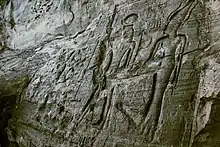 In the early Ramesside period several stelae, mostly commissioned by the Viceroy of Kush Amenemopet, were added. One of the stelae shows Seti I making an offering to the gods Khnum, Satet and Anket; another, done in sunk relief, shows a kneeling Amenemopet offering to a lunar god and to the goddess Satet. Several groups of striding figures are carved into the jebel rock.[2]