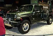On September 13, 2007, at the Defence Systems and Equipment International trade show, Chrysler LLC unveiled a Wrangler Unlimited version designed for military use dubbed the J8. The unarmored Jeep J8 is equipped with larger brakes, axles and suspension components than the civilian version and has a payload capacity of 1,339 kg (2,952 lb). The J8 also differs from the civilian model by utilizing heavy-duty rear leaf springs for carrying heavier payloads. The Jeep J8 is powered by a VM 2.8-liter (169 CID) four-cylinder turbo-diesel engine that produces 118 kW (158 hp) and 400 N·m (295 lbf·ft) of torque, providing towing capability of up to 3,500 kg (7,700 lb).[41] The engine is mated to a five-speed automatic transmission. The J8 also features a unique air-intake system with special filtration and a hood-mounted snorkel that enables the J8 to wade in water up to 762 mm (30 in) deep and tackle sandstorm conditions for up to five hours. Available as a two-door with an extended pickup bed for personnel or equipment transport, or a four-door multipurpose vehicle, it may be produced with numerous vehicle-body and seating configurations in either right-hand- or left-hand-drive.[42] Targeted for use by the militaries in overseas markets, the J8 is not available in the United States because it will not meet U.S. emissions requirements. The J8 will be produced in Egypt.[43]