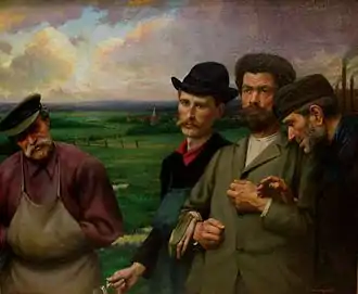 While he painted many society portraits he also created scenes of social realism depicting persons from the upper as well as the working classes, which show an insight into his subjects. Leempoels had an idealistic view of the role of the artist and expressed the opinion that it is the artist’s mission to make the world better or wiser. Art should therefore possess more than beauty and also express an idea and have a philosophical meaning.[13][14] This explains some of his paintings with titles such as 'Vision, cruel vision, why have you frightened me so often during the nights of my childhood? Why?'[14] Paintings with such philosophical intent include the painting Destiny and Humanity referred to above as well as the composition entitled Friendship (c. 1896, National Museum of Fine Arts in Buenos Aires). The iconography of the painting is derived from José de Ribera’s painting of a married couple entitled The Bearded Woman (1631, preserved in the Hospital de Tavera). Leempoels not only copied the facial features but also the gestures of the woman and her husband. Leempoels updated the clothing of the two figures, reversed the couple's position and diluted the reference to the original inspiration by not showing a naked breast nursing the child. The quotation by Leempoels of Ribera's original composition was not noticed by the contemporary reception. The work is understood to constitute two male portraits. When the painting was exhibited in 1897 at the Salon of the Société Nationale des Beaux Arts, it was described by an art critic as two portraits in one canvas of two male friends of the same age, whose "physiognomy displays average intelligence" and who hold hands as a "sign of an indissoluble communion of feeling".[15] Present-day views of the picture have emphasised the difficulty in interpreting representations of male bonding such as the one in Friendship.[16]