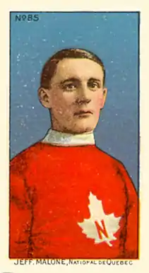 Patrick Jeffrey Elias Malone (March 17, 1888 – March 22, 1981[1]) was a Canadian professional ice hockey player. Malone played for the Montreal Wanderers and the Quebec Bulldogs as a spare player. He was the older brother of the more famous Joe Malone, who is a member of the Hockey Hall of Fame. Jeff won the Stanley Cup with his brother in 1913 playing as a spare center for Quebec. He was likely the last living member of the Bulldogs.[2]