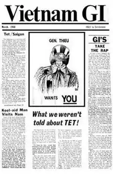 Vietnam GI quickly became a success among GIs stateside and in Vietnam[16] where soldiers like Terry DeMott, a helicopter door gunner in the Americal Division stationed near Chu Lai, and a number of sympathetic unit mail clerks helped circulate the paper surreptitiously. It was free to GIs, and requests for individual subscriptions as well as multiple copies for distribution in stateside barracks and Vietnam combat units soared, with the print run reaching 30,000 copies by fall 1968.[17] Letters-to-the editor indicated that single copies passed through many hands. In August a separate "Stateside" edition of VGI was launched.