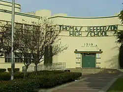 Thomas Jefferson High School, usually referred to as Jefferson High School, is a public high school in the Los Angeles Unified School District. Founded in 1916, it is the fourth oldest high school in the school district. Located in South Los Angeles, its surrounding communities are Downtown, Central-Alameda, Florence, Historic South-Central and South Park. Jefferson's school colors are kelly green and gold and the sports teams are called the Democrats, or Demos for short. In 2006, a pilot program called New Tech: Student Empowerment Academy began in the northeast portion of the school. New Tech has since become a separate charter school housed in the Jefferson building. In 2016 New Tech closed down and the available space is now used by Nava College Preparatory Academy a pilot school that was established in 2014.[2]