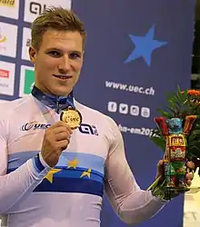 Jeffrey Hoogland (born 16 March 1993) is a Dutch track cyclist. He represented his nation in three editions of the 2013, 2014 and 2015 UCI Track Cycling World Championships.[1] At the 2015 UEC European Track Championships, he collected a total of three gold medals, individually in the sprint[2] and the 1 km time trial,[3] and with Nils van 't Hoenderdaal and Hugo Haak in the team sprint.[4]