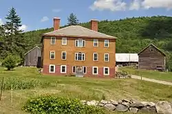 The Jeffrey House stands just north of Chester's Stone Village, set back about 200 feet (61 m) from the east side of Vermont Route 103. It is a two-story wood-frame structure, with a hip roof and wooden shingle siding. It is set in the side of a shallow hill, and its basement, partly rubblestone but finished on the west side in brick, is entirely exposed on the front facade. It is covered by a hip roof, with two interior chimneys. The front facade is five bays wide, with a former entrance at the center of the basement level (now boarded over) flanked by sidelights. Windows in the outer bays are sash, with simple surrounds, while the windows above the entrance are Palladian three-part windows with rounded centers. The interior follows a typical Georgian central hall pattern, with a center hall flanked by two rooms on each side on the ground floor. It varies from the pattern with a large ballroom extending in front of the chimneys on the second floor.[2]