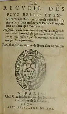 Jehan Chardavoine (baptized on 2 February 1538 at Beaufort-en-Vallée, Anjou – died c. 1580) was a French Renaissance composer mostly active in Paris. He was one of the first known editors of popular chansons, and the author, according to musicologist Julien Tiersot, of "the only volume of monodic songs from the 16th century that has survived to our days."[1]
